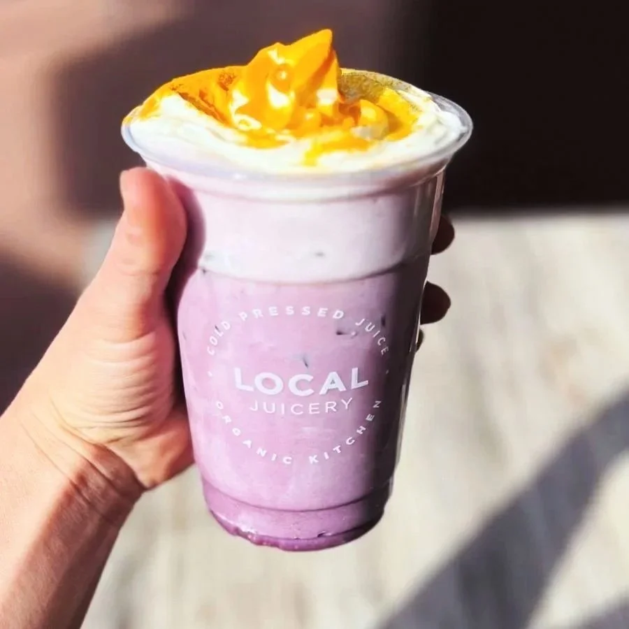 Royal Ube Latte laced with collagen, colostrum, organic ube, wildflower honey, minor figures oat milk, whipped cream, turmeric